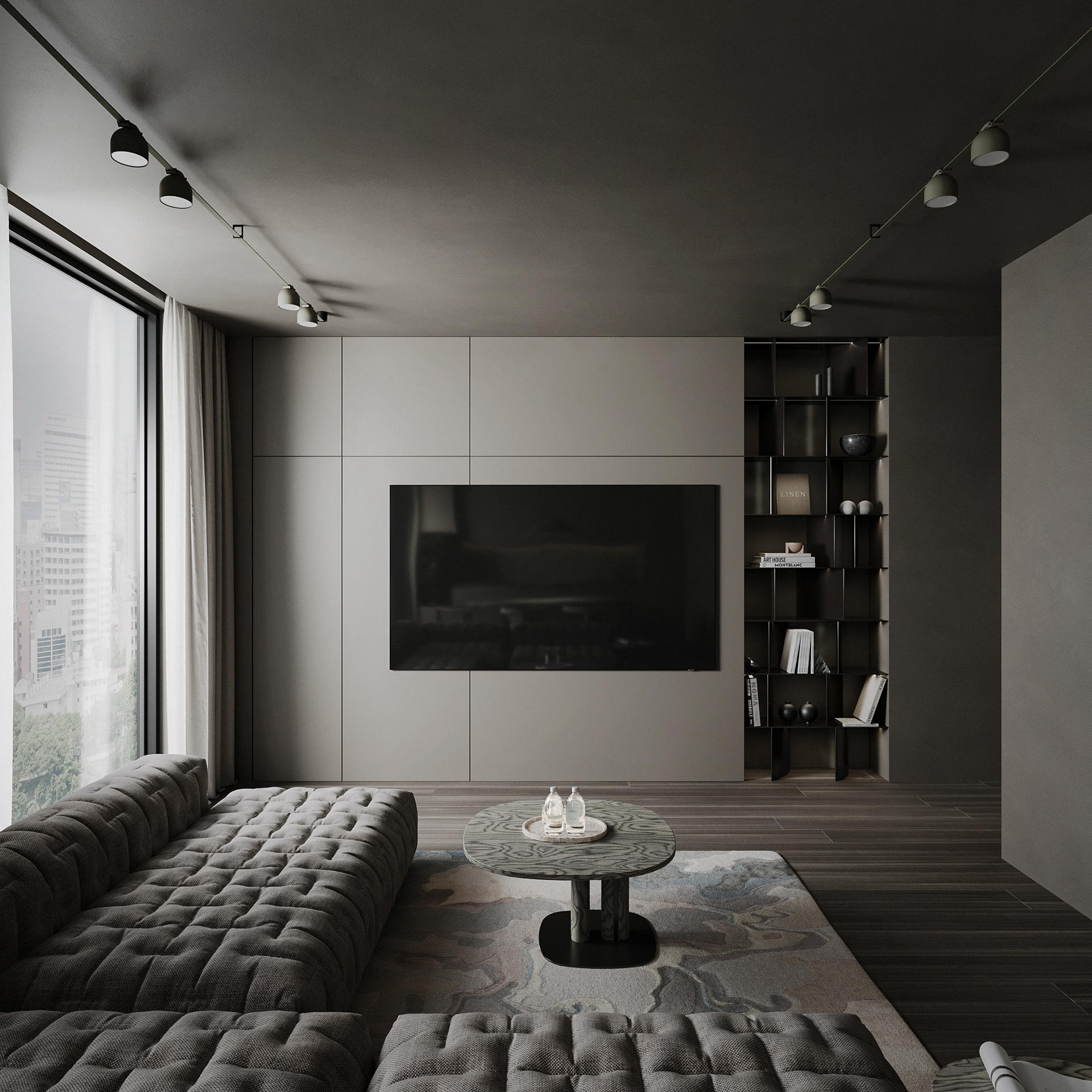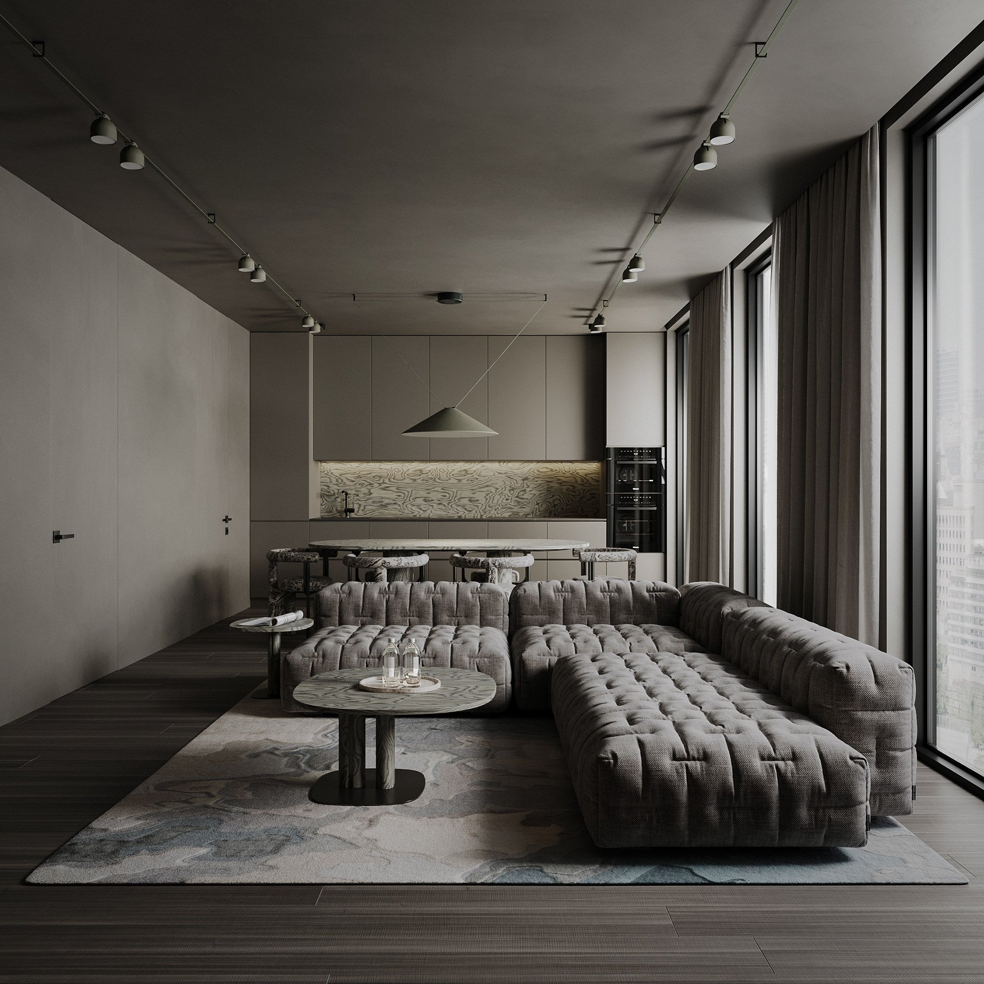 Muted tones, luxe textures, and minimalist elegance — a seamless blend of comfort and sophistication in this modern open-space living area.